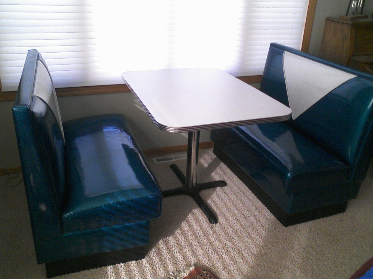 . Blue diner booth $900 Blue Vitro (brand) vintage V diner booth zodiac finish two benches with table